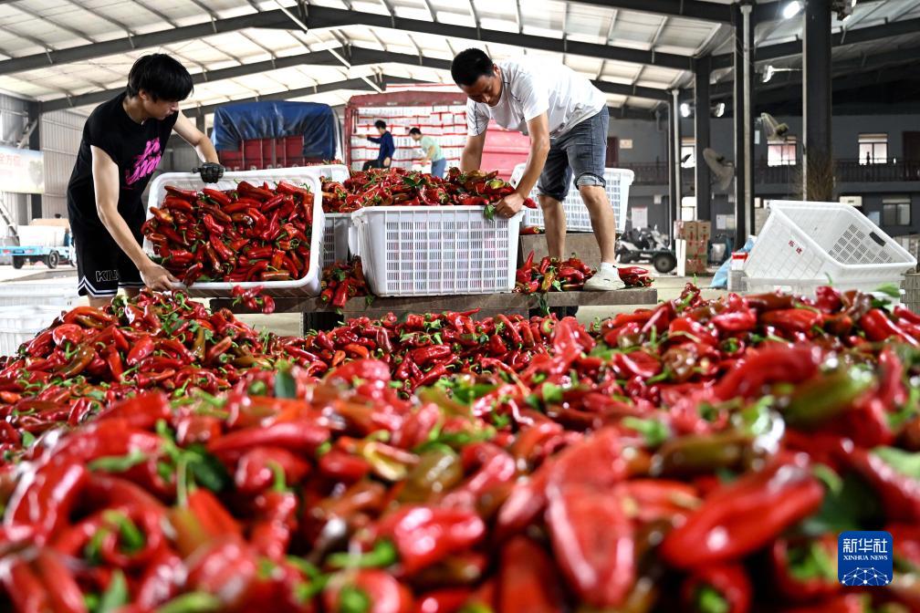 8月2日,安徽省蚌埠市五河县朱顶镇陈台村村民将采摘的辣椒运送到仓库。