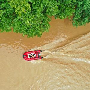 8月2日,救援人员在河北省涿州市市区乘坐冲锋舟前去转移受灾群众(无人机照片)。
