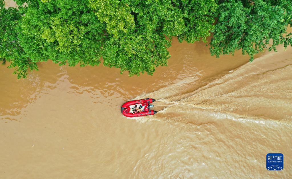 8月2日,救援人员在河北省涿州市市区内转移群众(无人机照片)。