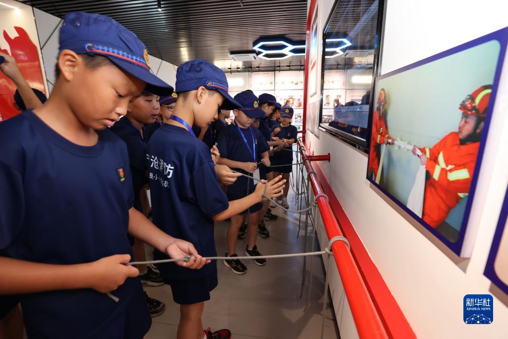 8月2日,在福建省厦门市消防科技教育馆,小学生在学习救生结绳法。