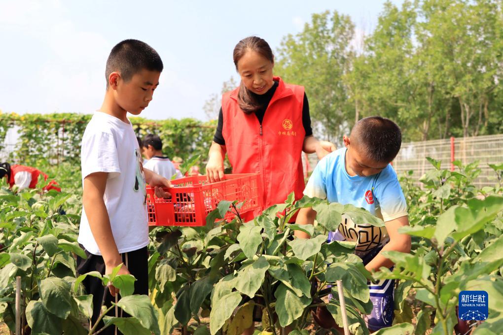 8月2日,在山东省聊城市茌平区胡屯镇周庄小学劳动实践基地,孩子们和志愿者一起采摘蔬菜。