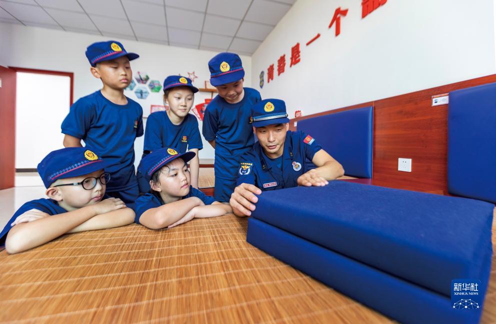 8月2日,在江西省永新县消防救援大队,消防员教孩子们叠“豆腐块”被子。