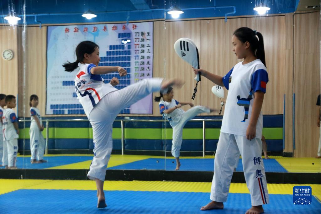 8月2日,在山东省高密市一家跆拳道培训机构,孩子们进行基本功训练。