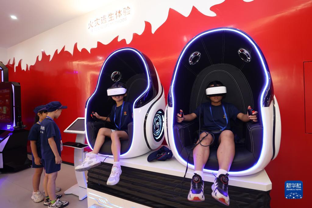 8月2日,在福建省厦门市消防科技教育馆,小学生通过消防VR设备体验火灾逃生。