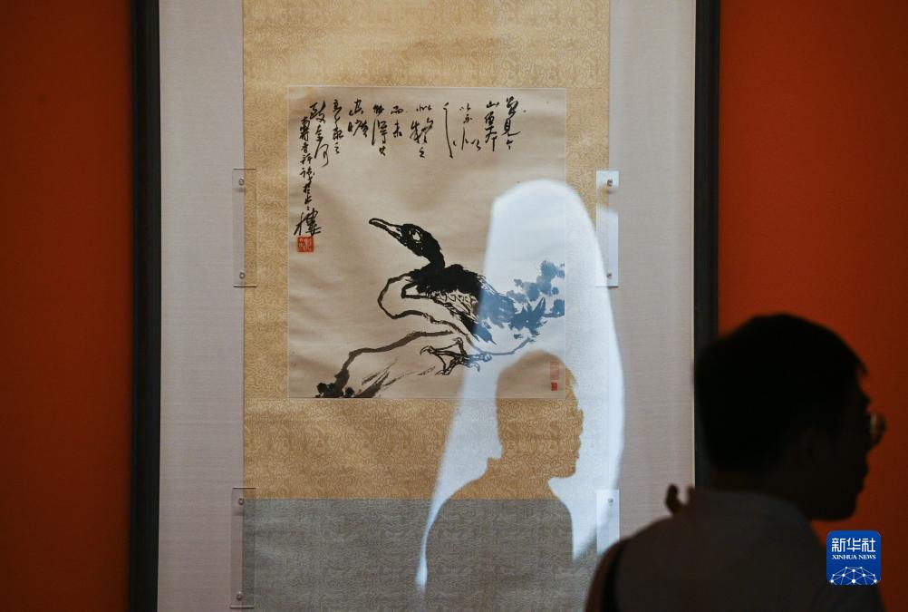 8月2日,参观者在北京民生现代美术馆欣赏潘天寿作品《墨鸭》。