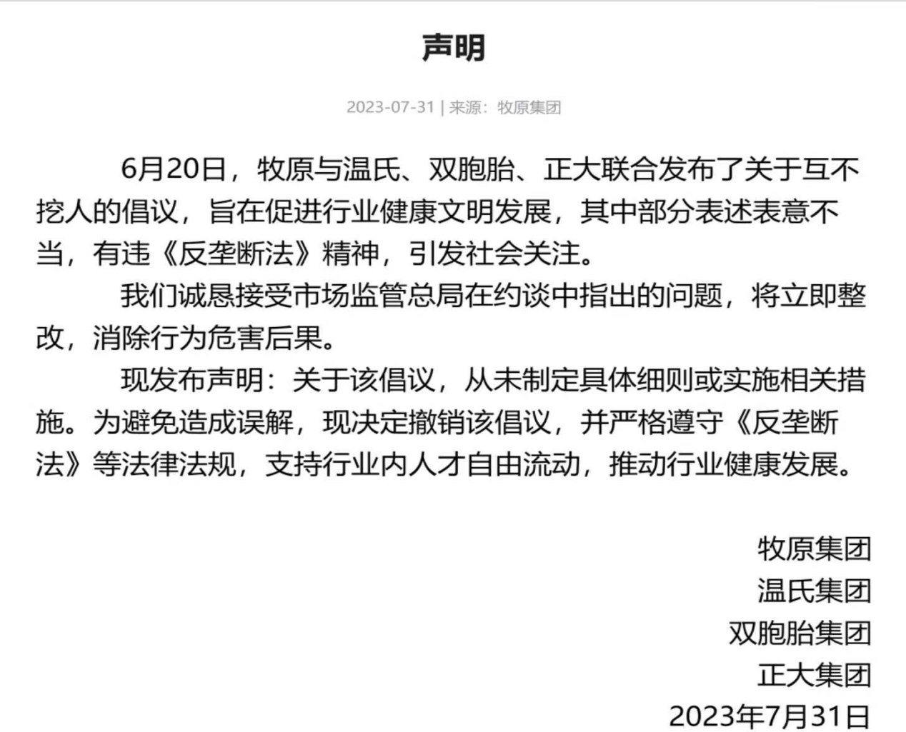 被约谈后,牧原集团、温氏股份、双胞胎、正大在官网、公众号等平台发布了一则联合声明。在声明中,这四家猪企承认《互不挖人公约》中部分内容表述不当,并表示该倡议从未制定具体细则或实施相关措施,为避免造成误解,决定撤销该倡议。