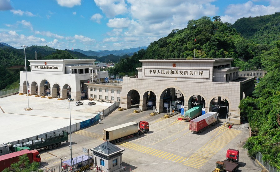 这是在广西凭祥友谊关口岸通关的运输车辆(无人机照片)。新华社记者 杨驰 摄