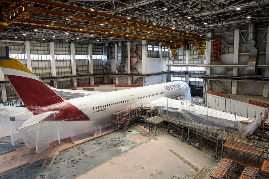 5月11日,喷涂作业员对空客A350-900宽体客机进行打磨除漆。新华社记者 张丽芸 摄