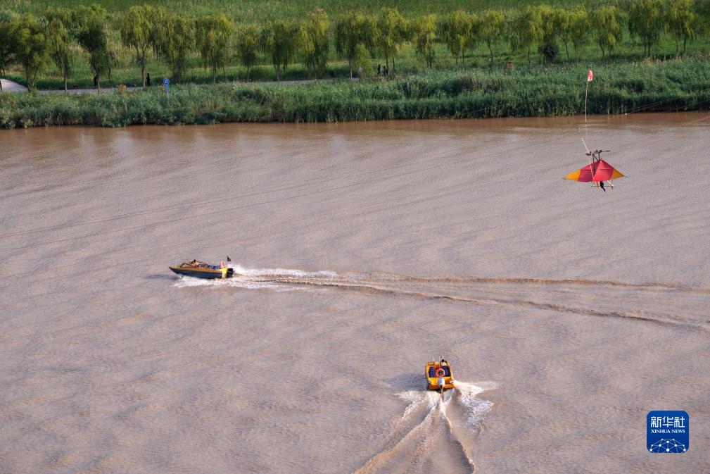 8月2日,游客在宁夏中卫市沙坡头景区体验飞渡黄河、快艇。