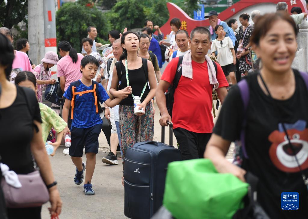 8月2日,Z180次受困列车的旅客离开安家庄临时安置点徒步前往转运客车。