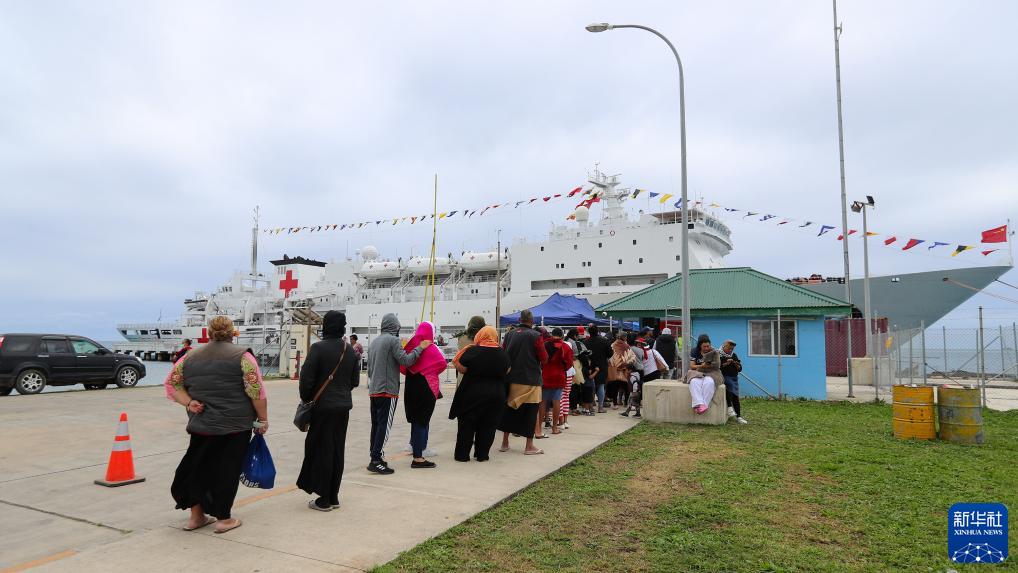 中国海军“和平方舟”号医院船靠泊汤加进行友好访问期间,当地民众和华人华侨在码头排队就诊(8月1日摄)。新华社发(黎宇 摄)