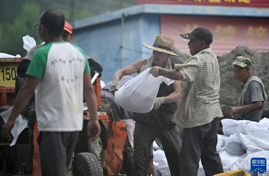8月3日,抗洪人员在天津市西青区辛口镇子牙河岸边搬运沙袋。