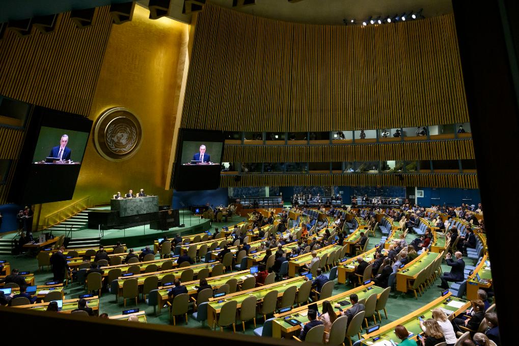 这是2022年8月1日在纽约联合国总部拍摄的《不扩散核武器条约》第十次审议大会会议现场。新华社发(联合国供图/洛伊斯·费利普摄)