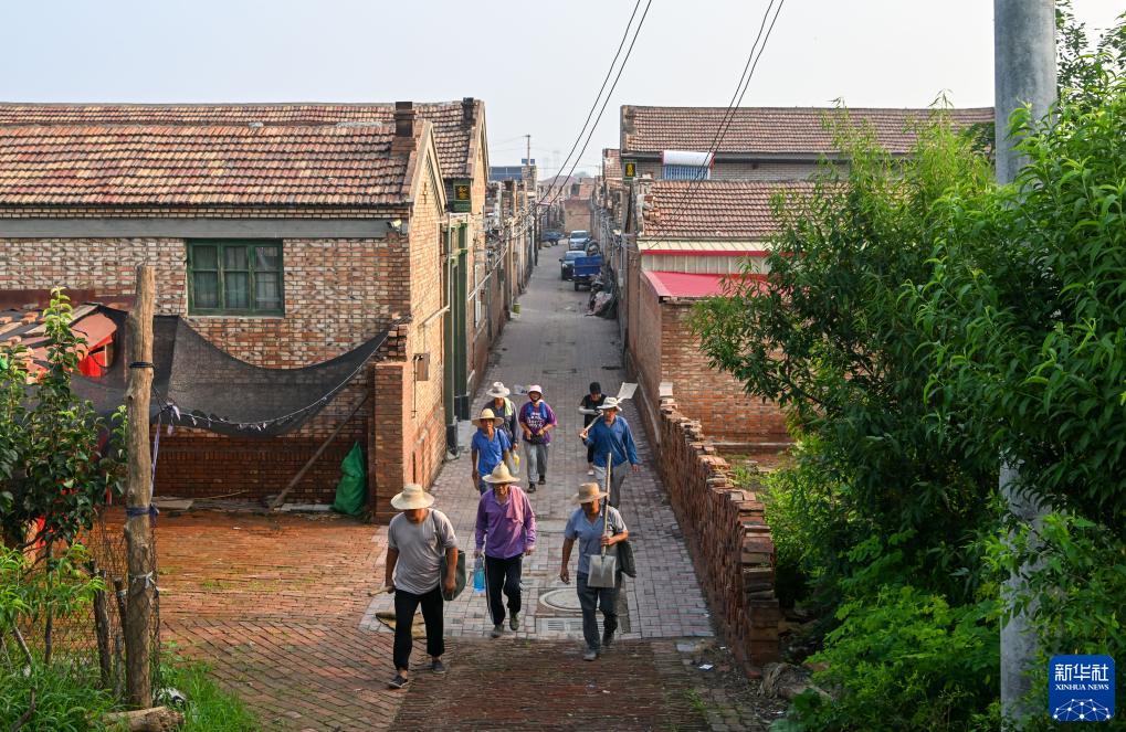 8月3日,在天津市静海区台头镇建设村,村民从村内走到河岸堤坝上参与堤坝加高加固工作。