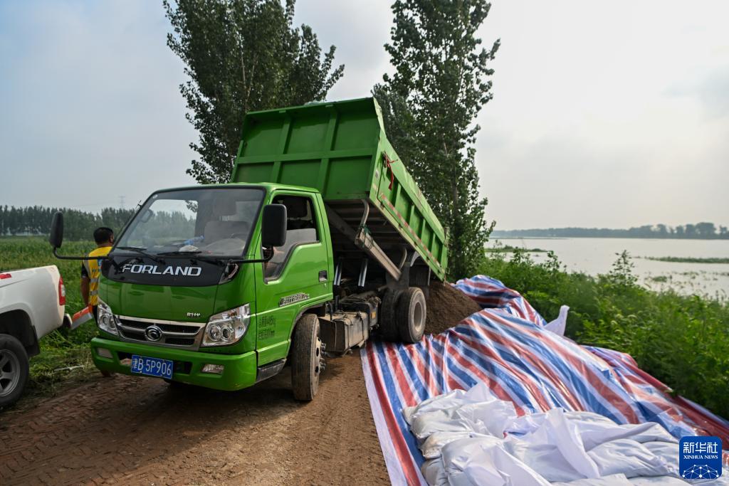 8月3日,在天津市静海区台头镇,运输车辆在大清河北堤上运送加高加固用砂石料。