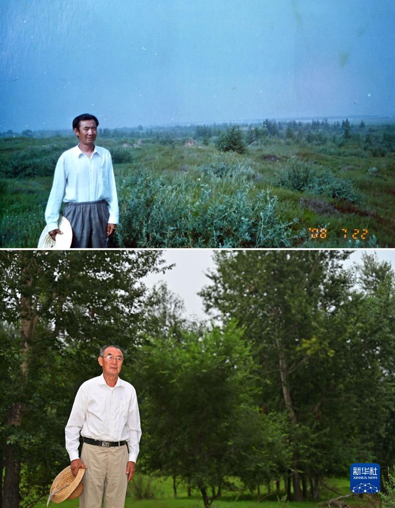 拼版照片:上图为2008年,百顺在植树时留影(资料照片);下图为2023年8月2日,百顺在树林前留影(新华社记者连振摄)。