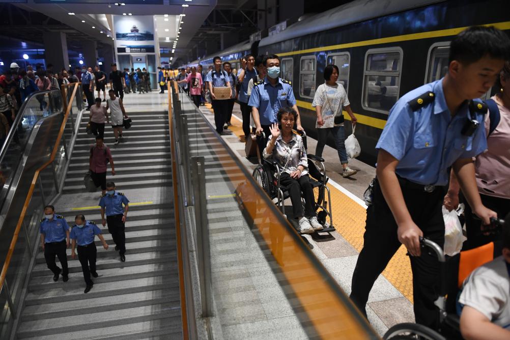 8月3日,K396次、Z180次列车的滞留旅客到达北京丰台站。新华社记者张晨霖 摄