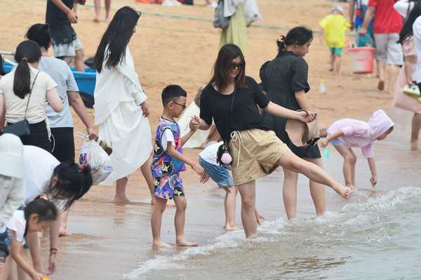 游客在山东省青岛市第一海水浴场戏水纳凉。