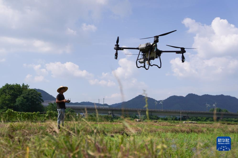 江西省新余市分宜县的农户操作无人机喷洒叶面肥(8月3日摄)。