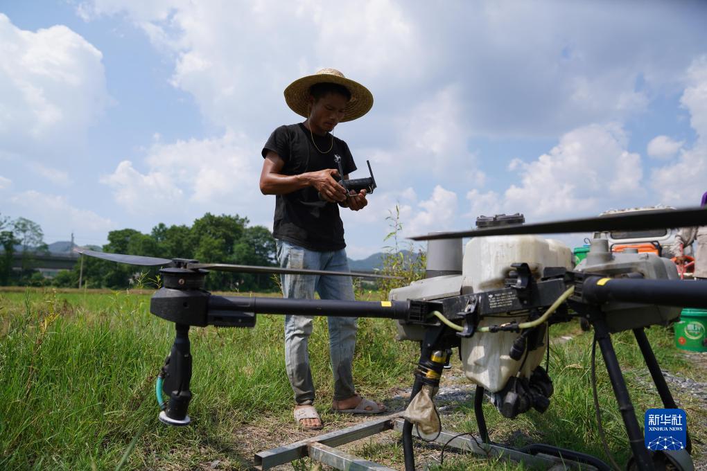 江西省新余市分宜县的农户操作无人机准备喷洒叶面肥(8月3日摄)。