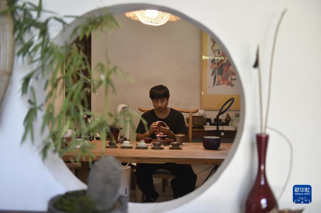 8月3日,在河南省禹州市神垕镇槐树湾村陶瓷创客基地,钧瓷艺人丁祥在自己的工作室里查看烧制完成的钧瓷作品。