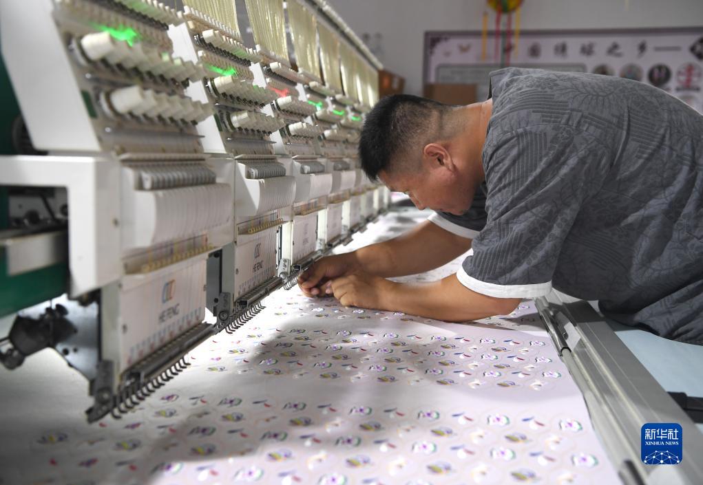 工人在靖西市绣蕴坊绣球文化有限公司用机器剪裁制作绣球所需布料(8月2日摄)。