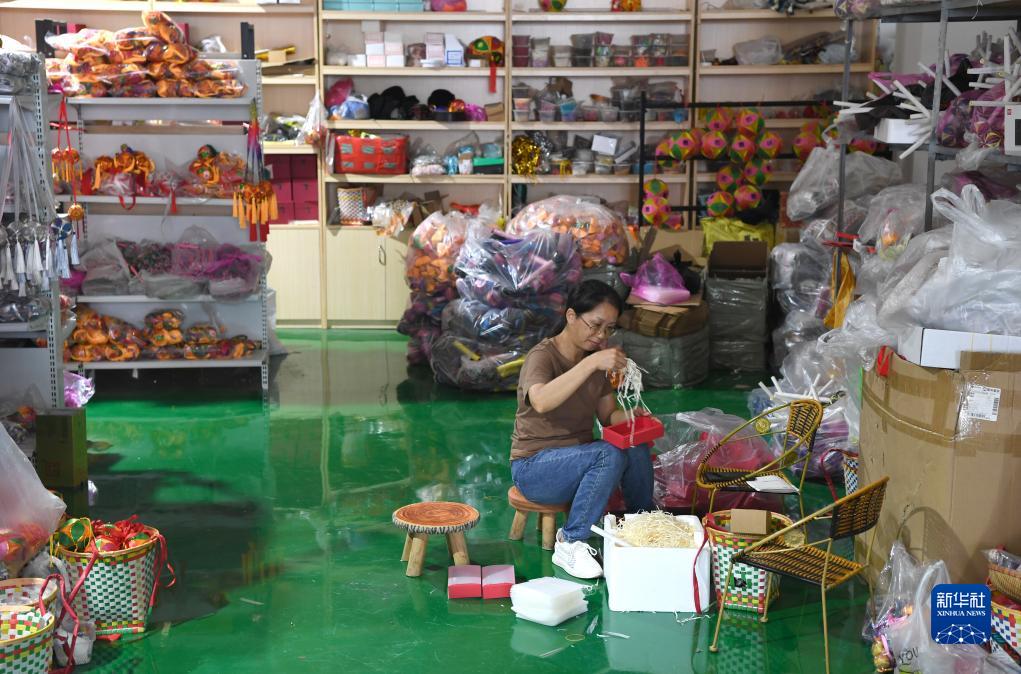 工人在靖西市绣蕴坊绣球文化有限公司包装绣球(8月2日摄)。