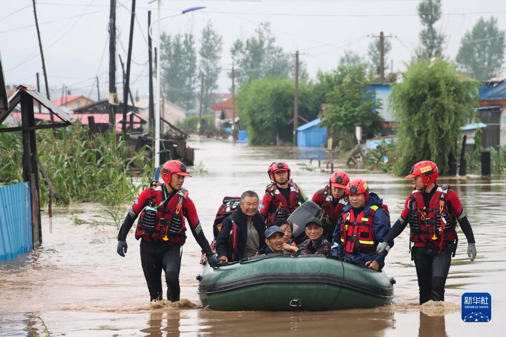 8月4日,哈尔滨市森林消防支队特勤大队消防员在尚志市一面坡镇万山村将被困群众转移至安全地域。