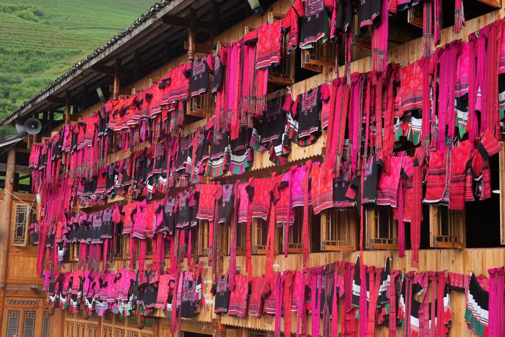 晒衣节这天,当地红瑶妇女把箱底的花衣、花裙拿出来晾晒。在碧绿梯田的映衬下,各家晒台上、走廊上,姹紫嫣红的衣裳鲜艳夺目。大寨村利用这个节日举办多种民俗活动。