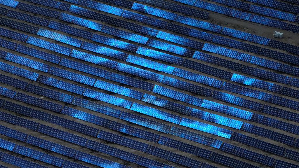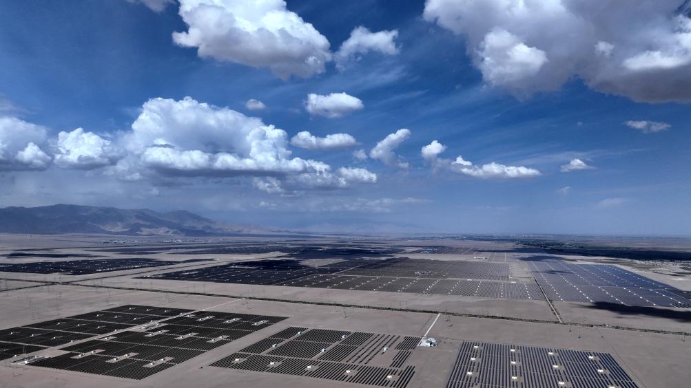 位于长江源区的柴达木盆地,荒凉的戈壁滩一望无际。在柴达木盆地中部的青海省海西蒙古族藏族自治州格尔木市,一片片深蓝色的“光伏海洋”在阳光下闪耀着光芒。