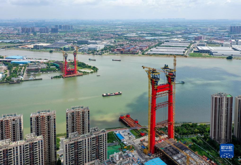 建设中的顺德大桥双主塔(无人机照片,8月4日摄)。