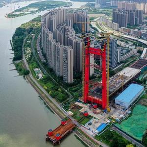 位于广东佛山市顺德区的顺德大桥是超大跨径钢混组合索塔斜拉桥,由中交路建承建,主桥全长992.5米,主跨626米,索塔采用变截面H型塔柱,塔高分别为204米、151米。目前,承建单位正采用自主研发的“智能钢塔提升机”进行顺德大桥主塔和横梁无支架整体安装作业。大桥建成后将有效打通顺德融入粤港澳大湾区“一小时交通圈”的内部区域道路瓶颈。