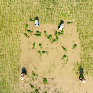 8月4日,在湖南省永州市道县寿雁镇芽洞村,农民抢插晚稻(无人机照片)。