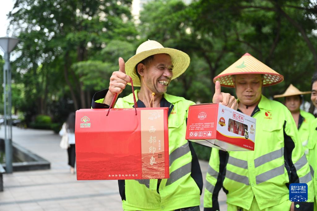 当日,在福州市鼓楼区,一些环卫工人领到由工会发放的西瓜、爱心凉茶、清凉大礼包等高温防暑慰问品。