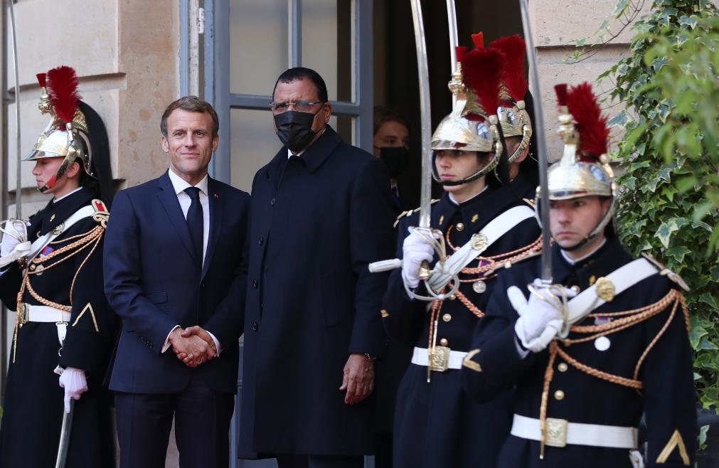 2021年11月12日,法国总统马克龙(左二)在法国巴黎欢迎尼日尔总统巴祖姆(左三)。(新华社记者高静摄)