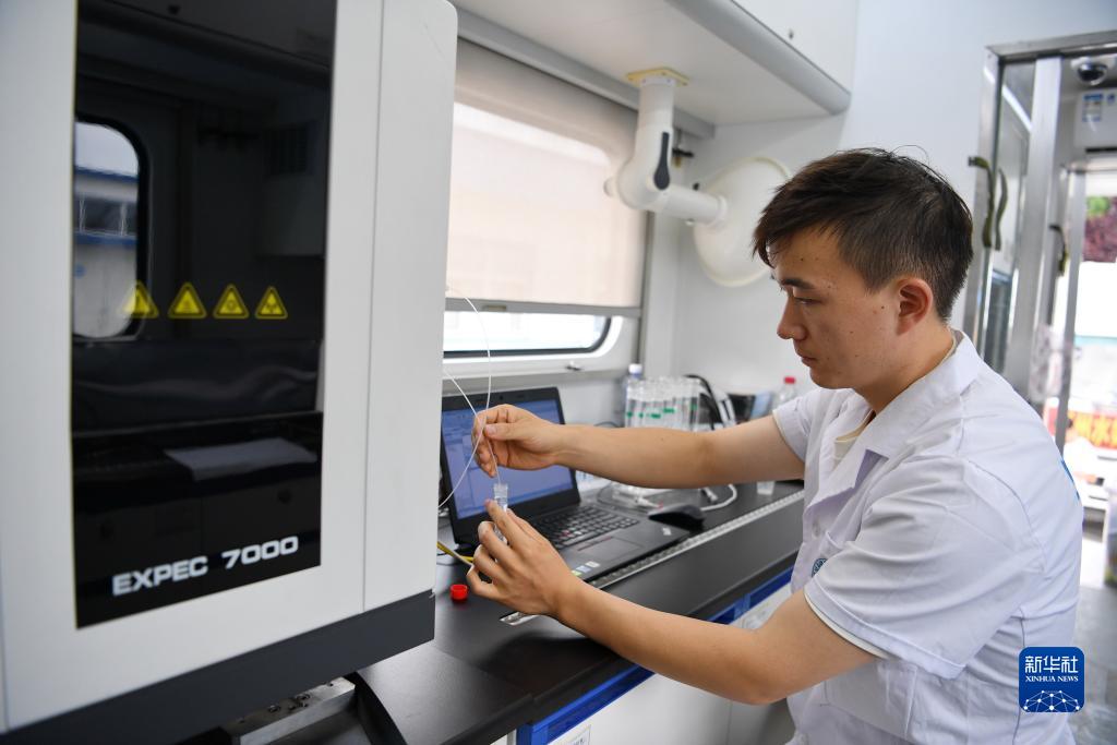 8月4日,在河北省涿州市一个临时制水供水站点,工作人员在水质化验车内检测水质。