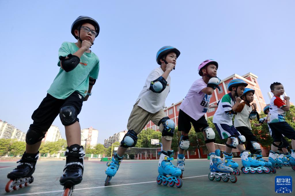 8月4日,在江西省吉安市峡江县实验小学,孩子们进行轮滑训练。