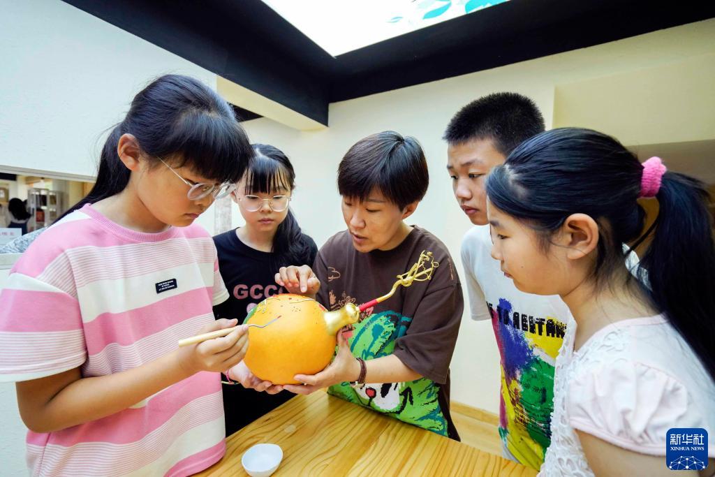 8月4日,民间艺人在河北省遵化市一公益培训班指导孩子们创作葫芦画。