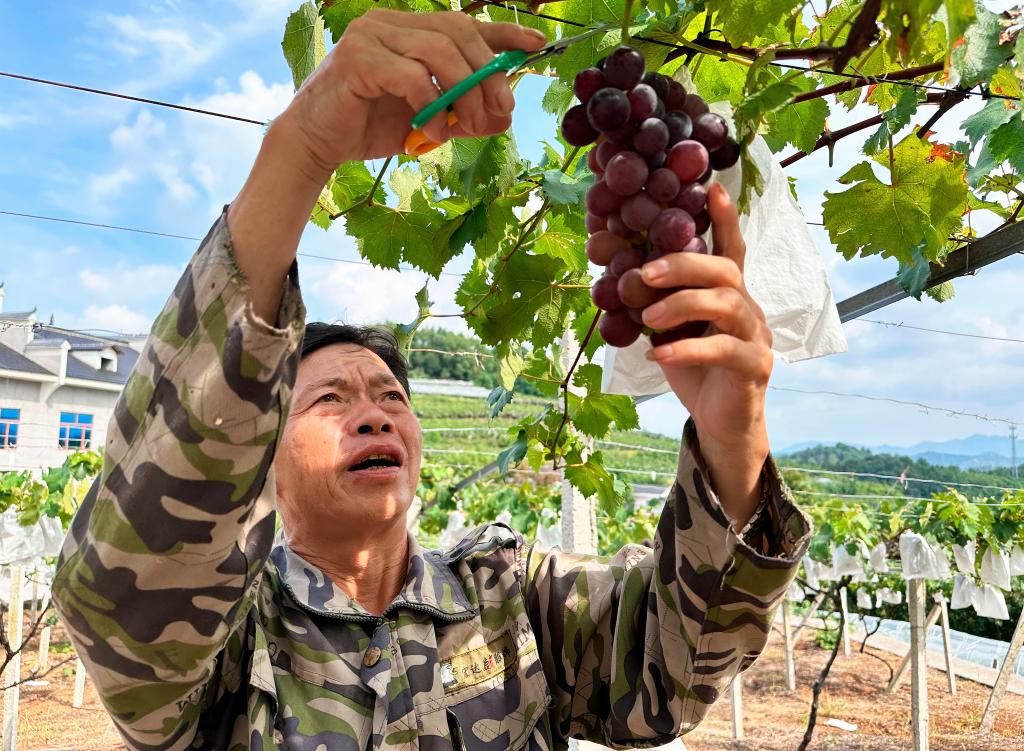 在湖南省冷水江市铎山镇眉山村,67岁的谢桂民顶着烈日穿梭在葡萄种植基地,他一边摘下紫里透红的葡萄,一边笑呵呵地盘算着今年的收成:“150亩葡萄,少说也能有200多万元收入。”