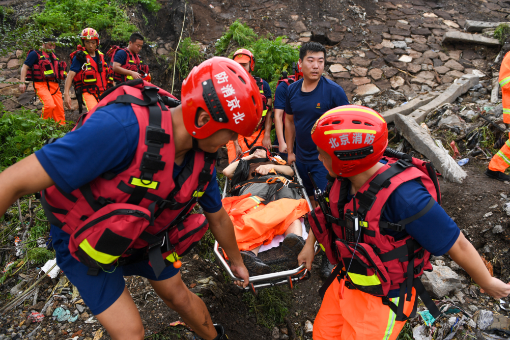 8月1日,在北京市门头沟区水峪嘴村,在此增援的北京大兴区消防救援支队的消防员在转运一名受伤村民。新华社记者 鞠焕宗 摄