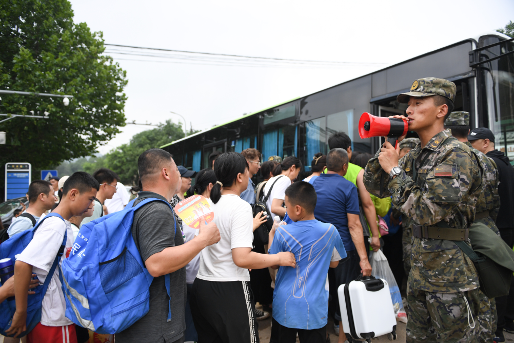 8月2日,在北京市门头沟区妙峰山镇政府附近,武警北京总队机动三支队官兵引导旅客排队乘坐大巴车转移。新华社记者 鞠焕宗 摄