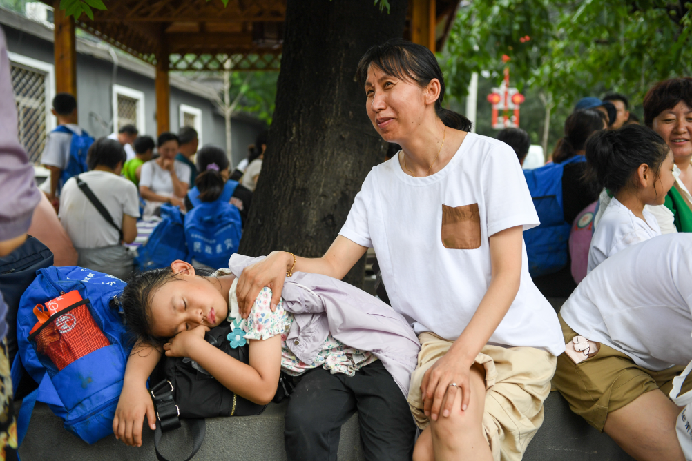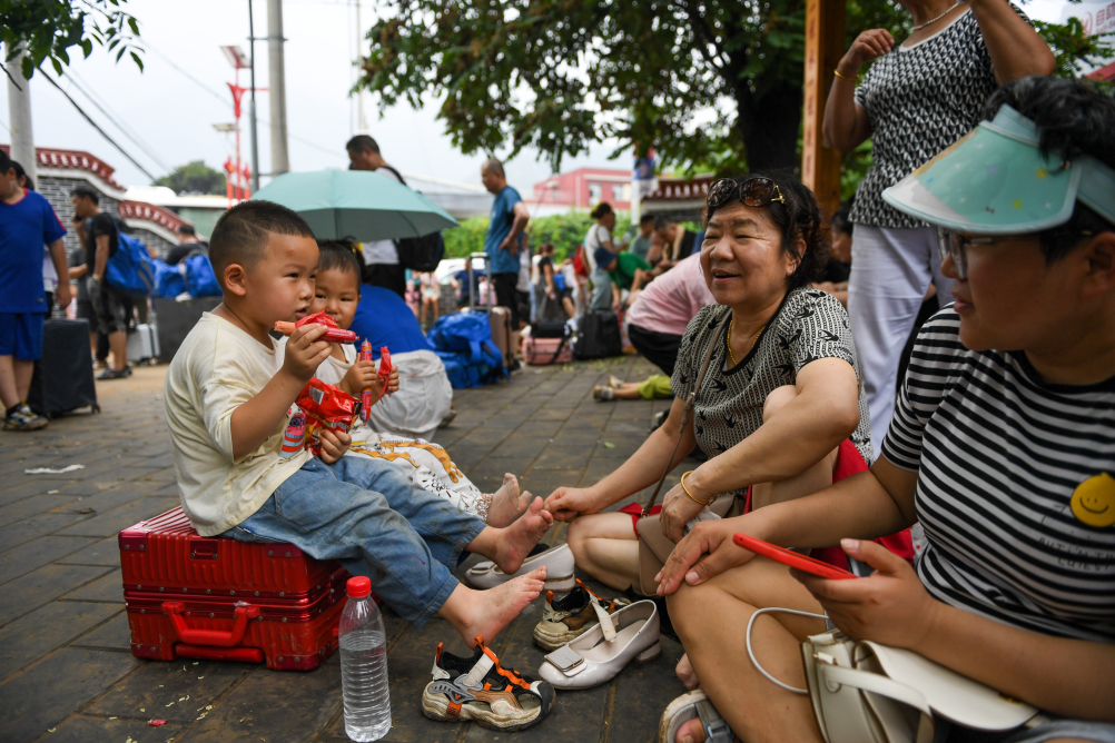 8月2日,K396次列车旅客在北京市门头沟区妙峰山镇政府附近休息,等候转运。新华社记者 鞠焕宗 摄
