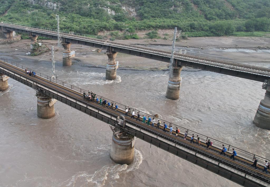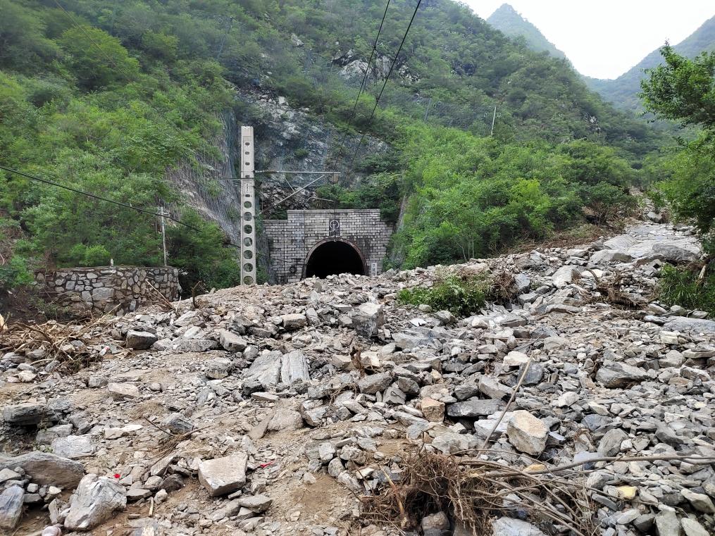 从空中俯瞰这蜿蜒的队伍,正如同一条“生命通道”,更让我深深感到,只有平安才是最近的回家路。一路前行,河床上倒伏的树木、桥墩上残留的水渍、损毁的路基、被塌方堵住出口的隧道……丰沙铁路受损情况映入我们眼帘,道路难走的程度远超我们的预期。漆黑无光的狭长隧道里,满是淤泥和积水,虽然雨停了,但是仍有水顺着隧道里的石缝渗漏,前方行进队伍不时传来“前面积水,靠右行进”“枕木湿滑,小心一些”是声音,提醒后方人员注意。