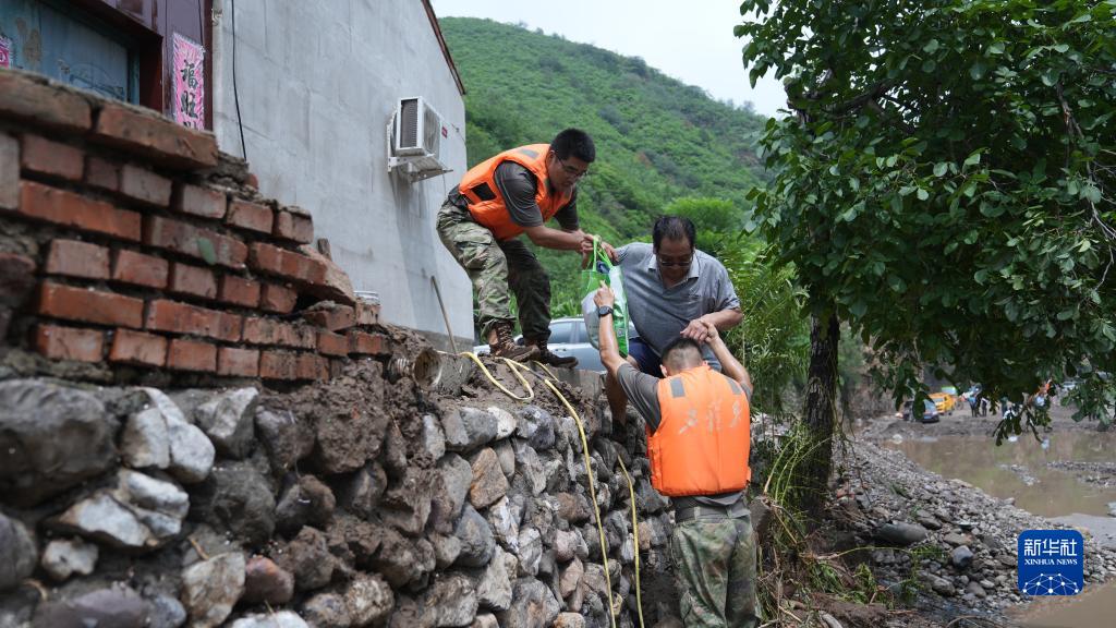 中部战区陆军第82集团军某工兵旅官兵在北京市昌平区流村镇帮助被困群众转移(8月2日摄)。新华社发(郭磊磊 摄)
