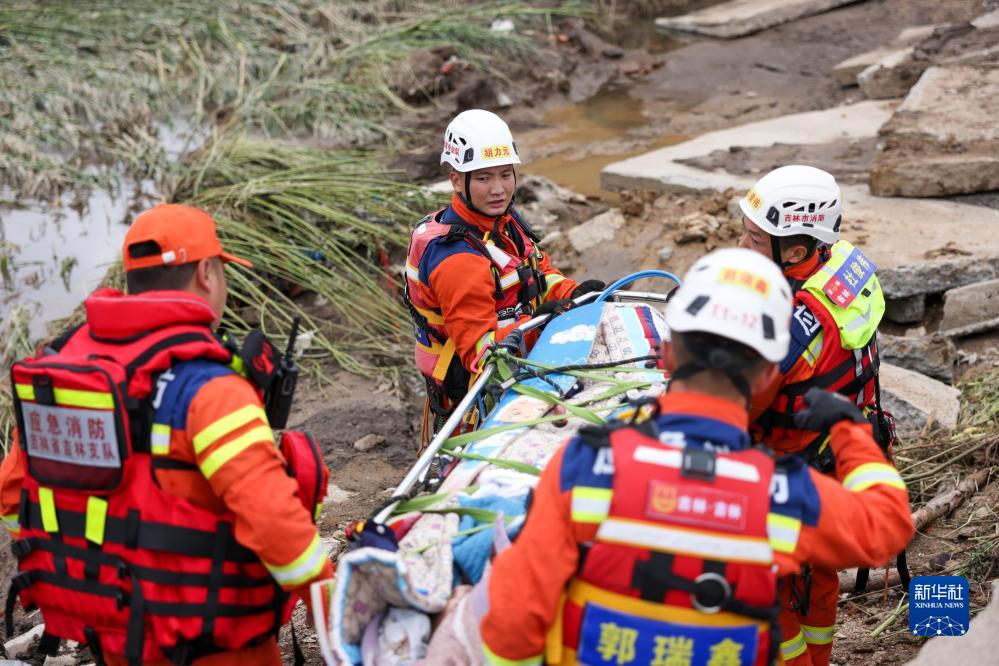 8月6日,吉林市消防救援支队队员用担架抬着曲凤霞通过损毁路面。