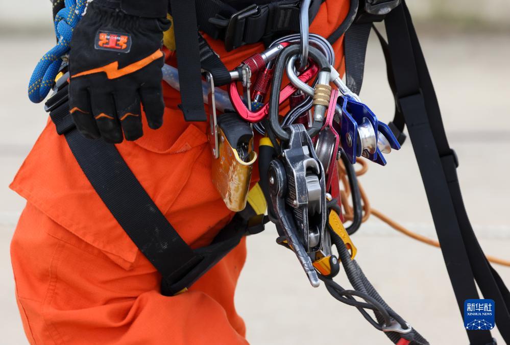 8月6日,吉林市消防救援支队队员整理身上的绳索工具。