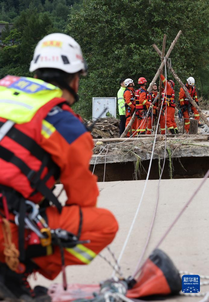 8月6日,吉林市消防救援支队队员在断桥上搭设绳桥。