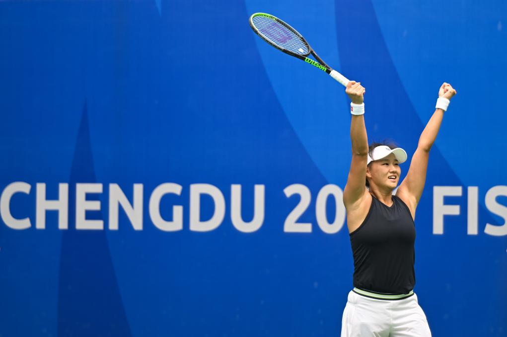 8月6日,中国选手郭涵煜获得成都大运会网球女单金牌后庆祝胜利。新华社记者 刘磊 摄