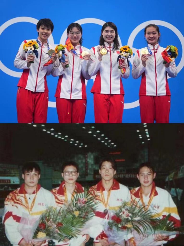 上图为李冰洁(右一)和队友们在东京奥运会接力夺冠,下图为当年李健(左一)和河北队队友们