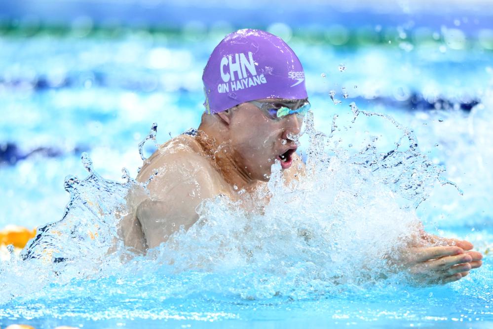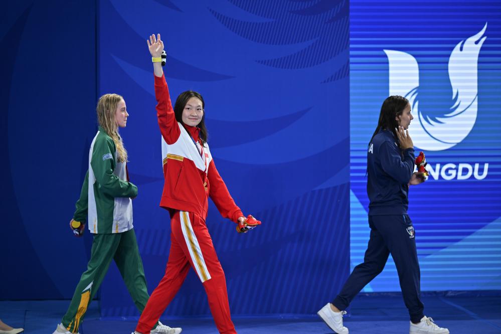 覃海洋在男子50米蛙泳决赛中一入水就开足马力,在全场欢呼中以26秒53的成绩率先触壁,摘得金牌。继福冈世锦赛夺得男子50、100和200米蛙泳冠军后,覃海洋在本届大运会上再次拿下蛙泳“三冠王”。意大利队的维贝蒂、平祖蒂分别获得银牌和铜牌。